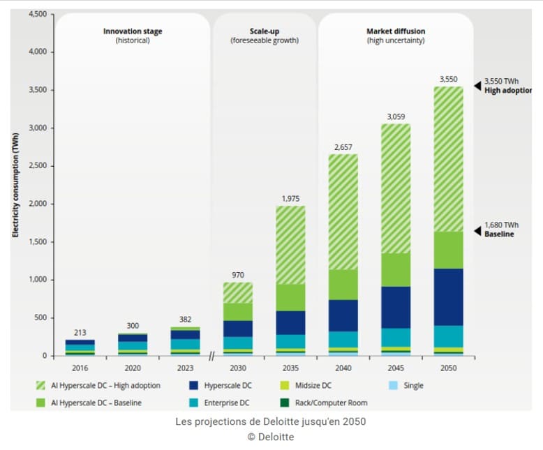 Data centres require colossal amounts of energy. According to a study by Deloitte, at the current rate of adoption, power consumption in data centres, under the pressure of AI, could increase ninefold by 2050.
