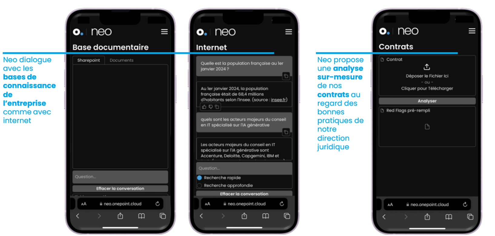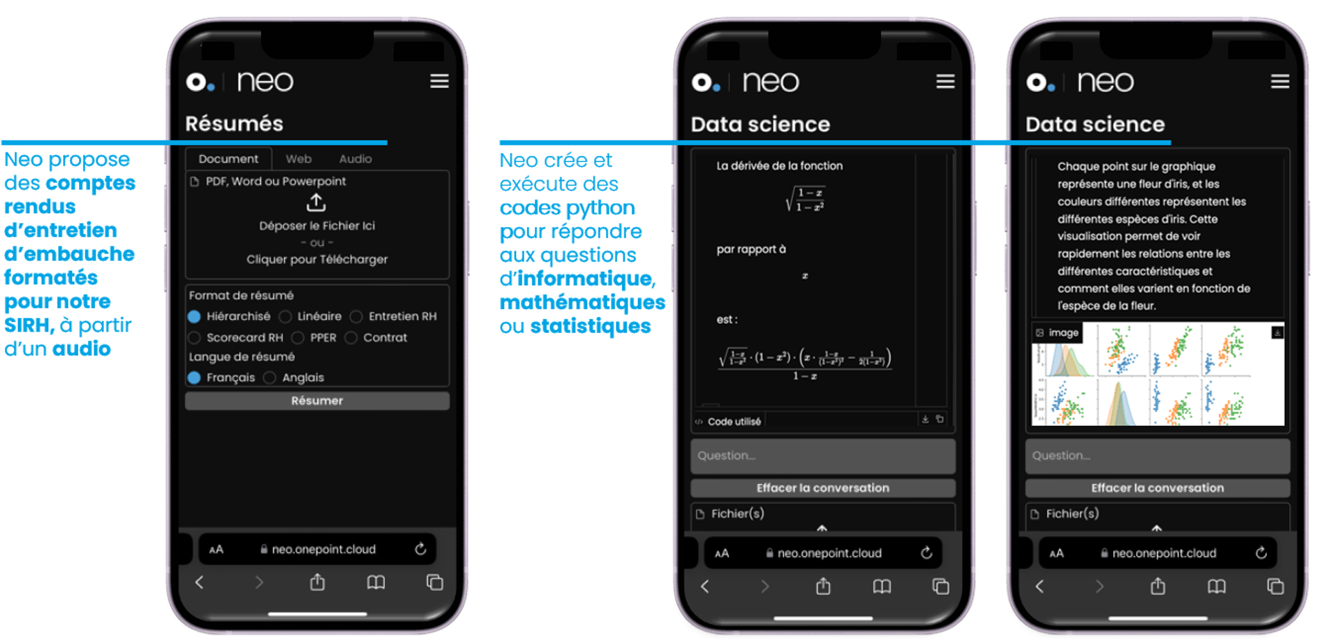 Neo, l’assistant d’IA multi-primé de Onepoint, notamment pour son ROI, sa frugalité, et son adaptabilité aux cas d’usages de votre entreprise