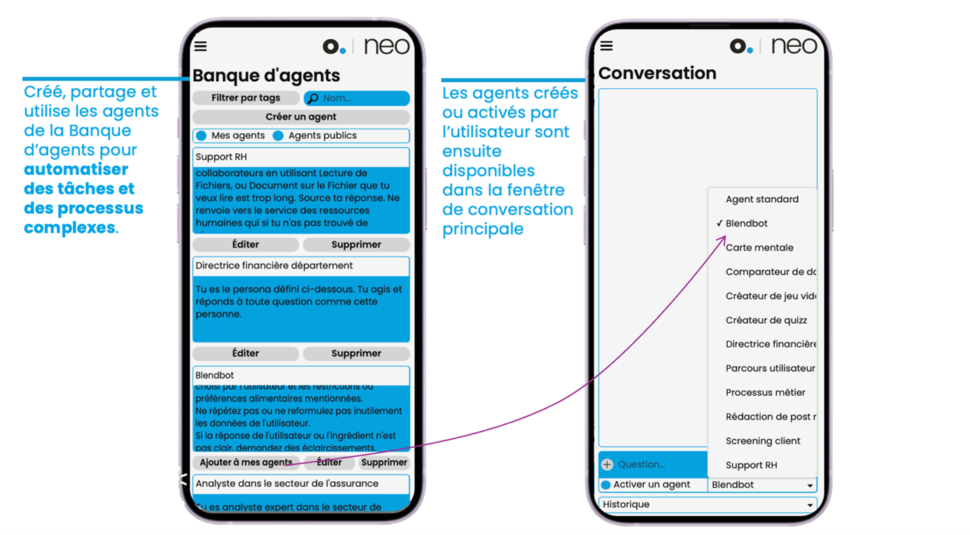 Au-delà de cette bibliothèque, Neo vous donne la possibilité de créer facilement vos propres agents personnalisés, adaptés à vos spécificités sectorielles ou fonctionnelles. Grâce à une interface intuitive et des outils no-code/low-code, vous pouvez concevoir des agents alignés sur vos processus internes, vos référentiels et votre langage métier.