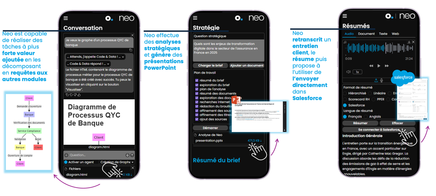 Utilisé par nos 3500 collaborateurs à travers le monde depuis l’été 2023, Neo est un assistant conversationnel, multilingue, multi-modal et multi-écrans.