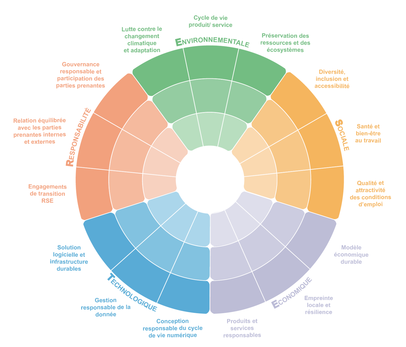 Elle s’appuie sur une évaluation semi-quantitative des 5 domaines RESET (Responsabilité Economique Sociale Environnementale et Technologique) représentée sur un radar. Chaque domaine est étudié à travers 3 thématiques, elles-mêmes composées de plusieurs critères.  C’est ainsi une quarantaine de critères qui sont étudiés pour évaluer à 360° les projets, avec des questions aussi variées que la qualité des relations parties prenantes, le cycle de vie des produits et services, la durabilité des modèles économiques ou encore la santé et le bien-être au travail.