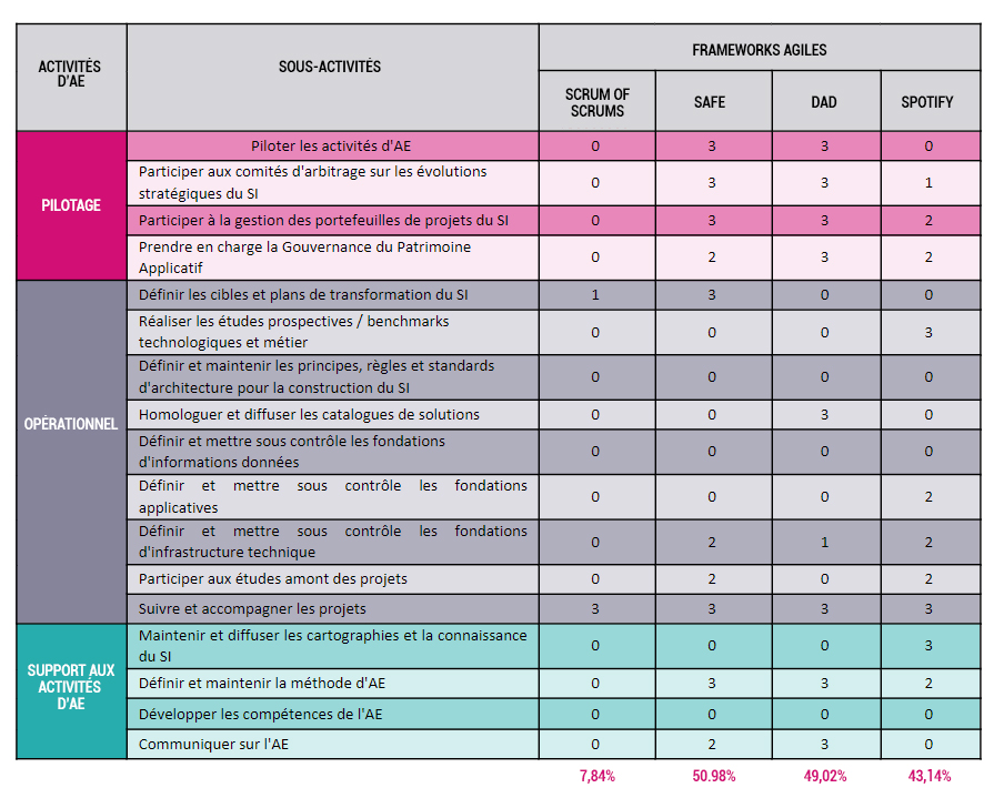 Les principaux frameworks agiles (SAFe, SoS, DaD, LeSS,…) couvrent moins de 50% des principales activités d’architecture d’entreprise (pilotage, opérationnel et support aux activités d’architecture d’entreprise), les autres, telles que Scrum of Scrum (SoS), ne couvrent qu’un très faible nombre de sous-activités (cf. figure 2).