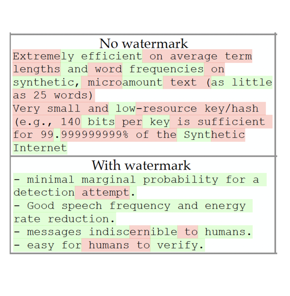 Pour éviter que son texte ne soit démasqué par un détecteur de filigrane, un fraudeur devra l’effacer ou au moins l’atténuer. Pour y parvenir il devra augmenter de manière significative la fraction de mots « rouges » du texte ce qui abaissera le seuil de détection. Plus généralement, il s’agit de masquer toute empreinte statistique que pourraient détecter les approches zero-shot et les classifieur binaires.