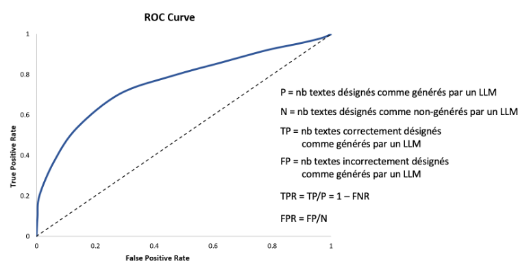 La courbe ROC exhibe donc le compromis n°1, élémentaire et incontournable, entre les erreurs de type I et II. Ce compromis n’est cependant en rien spécifique à la détection de textes rédigés par un LLM !