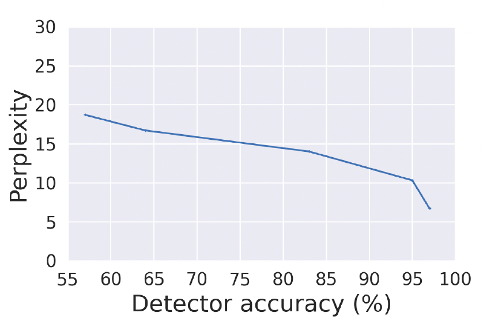 On considère généralement qu’une augmentation de 3 points de perplexité correspond à une diminution perceptible de la qualité du texte. La figure précédente illustre comment la perplexité du modèle OPT-1.3B, un LLM récent basé sur un Transformer avec 1.3 milliards de paramètres, diminue à mesure qu’augmente la proportion de texte paraphrasé à l’aide d’un modèle PEGASUS, un LLM avec seulement 220 millions de paramètres. Pour faire chuter la précision de 97% à 80% il faudra que l’attaquant consente à perdre 3.5 points de perplexité du texte paraphrasé.