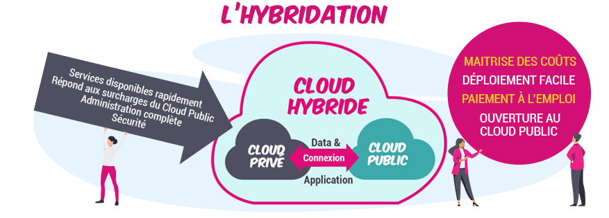 L’hybridation consiste à tirer parti des avantages des deux approches tout en limitant leurs inconvénients. Il s’agit de relier un Cloud public et un Cloud privé. Cette relation est uniquement d’un Cloud vers un autre. On peut ainsi bénéficier de la sécurité et de l’administration complète du Cloud privé tout en profitant de services rapidement disponibles et de la capacité de montée en charge du Cloud public.