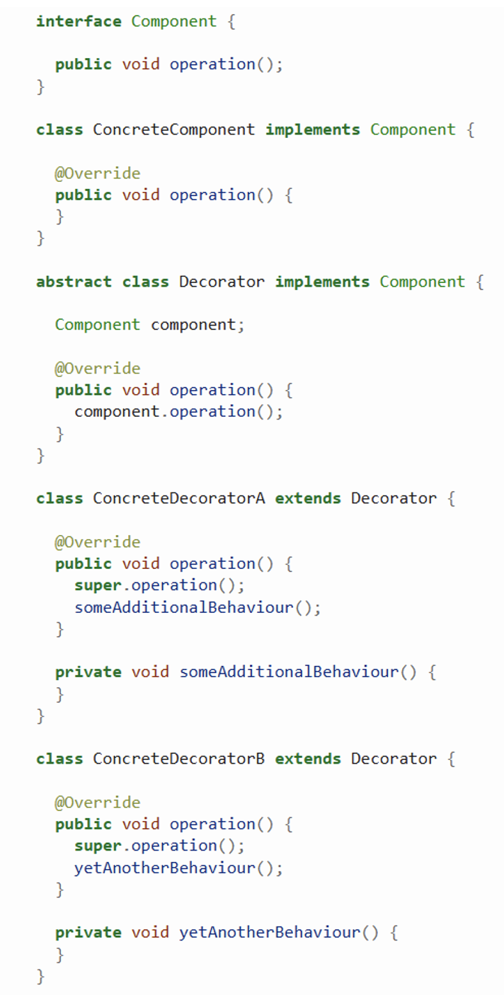 Pour illustrer concrètement comment fonctionne Javanalyser, prenons l’exemple du « patron décorateur » montré dans le listing ci-dessous. Un décorateur est une structure qui permet d’ajouter des responsabilités dynamiquement et en série à un composant décoré sans passer par l’héritage.