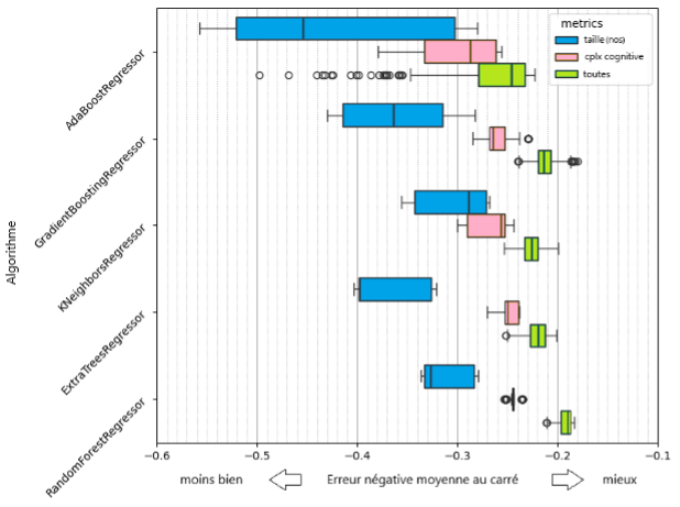 Les résultats révèlent que la précision et la stabilité des prédictions s’améliorent progressivement selon les métriques utilisées : d’abord avec la taille seule, puis avec la complexité cognitive, et enfin avec l’ensemble complet des métriques.
