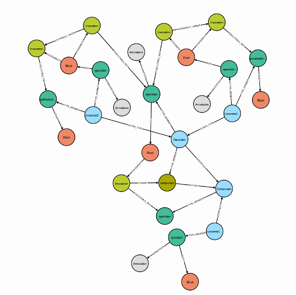 Cette implémentation produit le graphe de code ci-dessous. Chaque nœud représente un élément de programme, comme une variable, une méthode, ou une invocation de méthode. Les relations entre ces nœuds représentent les relations entre ces éléments de programme. Pour plus de visibilité, les éléments de programme à l’intérieur des blocs de code n’ont pas été représentés sur cette figure.
