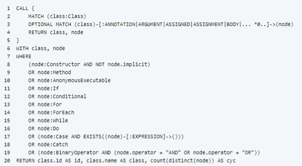 Sur un tel graphe de code, il est possible de calculer les métriques statiques de code. Pratiquement, ce calcul a été implémenté au sein de Javanalyser, afin de pouvoir automatiser au maximum l’analyse des métriques. Un ensemble de 33 métriques a ainsi été formalisé à l’aide du langage déclaratif Cypher, au niveau des classes Java. Le listing ci-dessous montre un exemple typique de requête qui calcule la complexité cyclomatique des classes du graphe de code. La complexité cyclomatique indique à quel point un programme est difficile à comprendre ou à tester. La requête est structurée en trois parties :