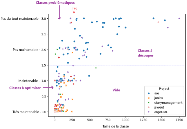 La figure suivante illustre ce jeu de données, chaque point représentant une classe positionnée selon sa taille et son niveau de maintenabilité.  Comme évoqué précédemment, la taille des classes Java est un facteur confondant important pour l’ensemble de métriques et a fortiori pour la prédiction de maintenabilité.