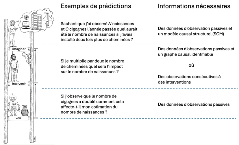 Judea Pearl, informaticien et philosophe américain, lauréat du prix Turing en 2011 et inventeur d’une approche des problèmes de causalité, a proposé une représentation symbolique des différents types de prédictions utiles en pratique. Celle-ci est désignée sous le nom d’échelle de la causalité.