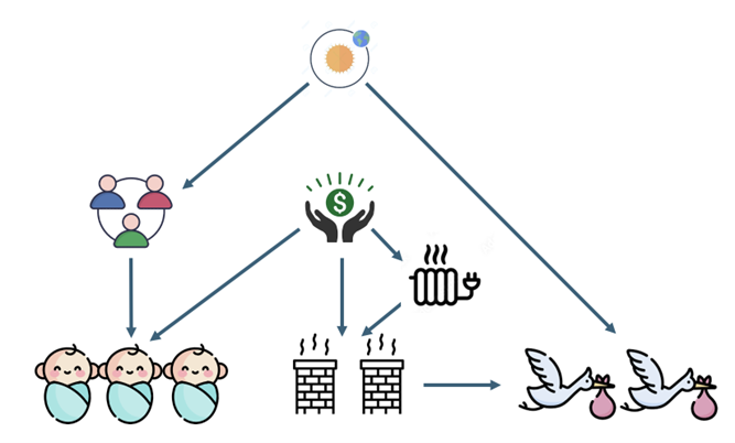 Dans notre histoire, X pourrait représenter le nombre de cigognes venues nicher dans une région, Y le taux de natalité, et Z le mouvement du soleil autour de la Terre, qui influence à la fois les relations sociales et les migrations des oiseaux.