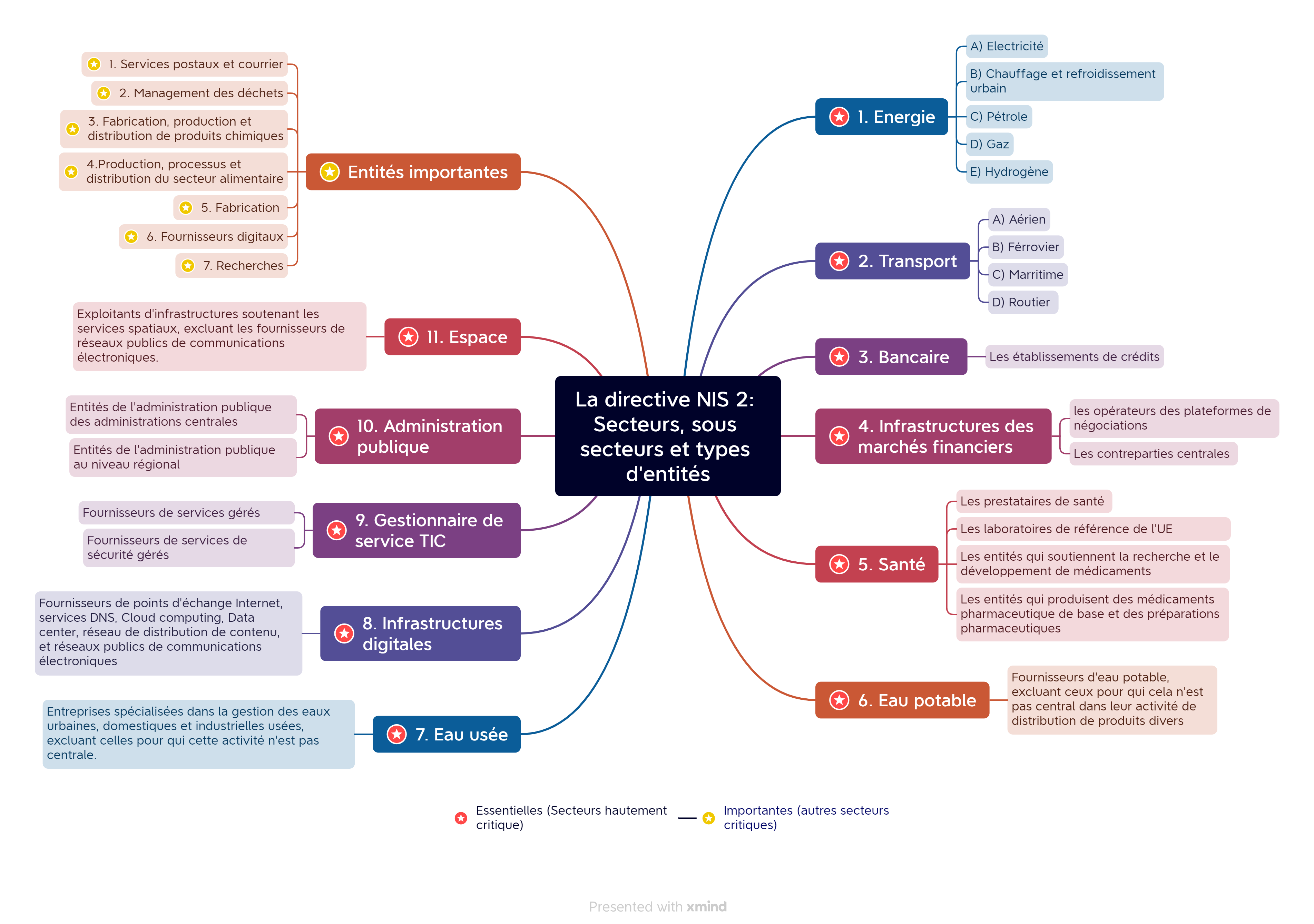 - 11 secteurs hautement critiques : énergie, transports, bancaire, infrastructures de marché financier, santé, eau potable, eaux usées, infrastructures digitales, gestion de services TIC (interentreprises), l’administration publique et l’espace.