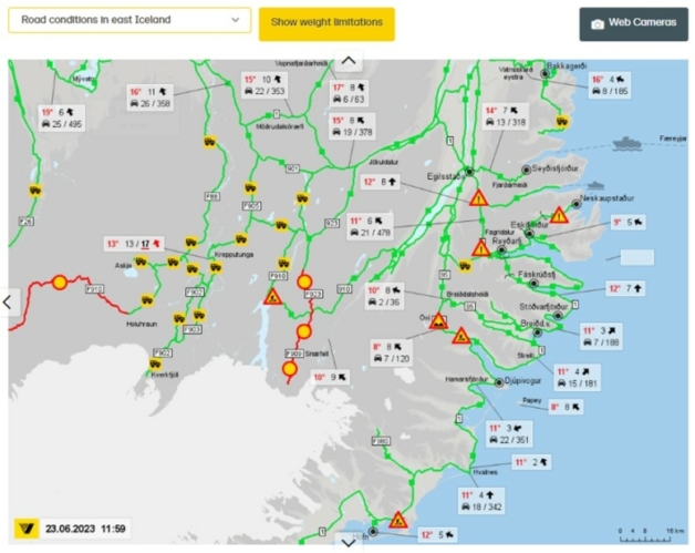 Très ergonomique, elle regroupe sur une carte quelques couches de données simples (types de routes/pistes, aires de repos, webcams) et les croise avec des informations temps réel. La météo (température, sens et direction du vent, taux d’humidité), et le comptage de véhicules (combien sont passés dans le dernier quart d’heure, combien dans la journée, et ce dans les 2 sens) sont intégrés. Ceci permet au voyageur de se faire rapidement une idée précise de l’état de la route qu’il souhaite emprunter et de prendre une décision éclairée.
