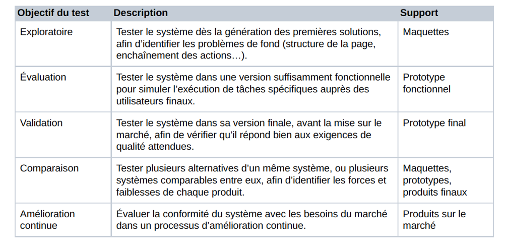 Le tableau ci-dessous présente l’utilisation des différents supports en fonction des objectifs visés par le test d’utilisabilité.