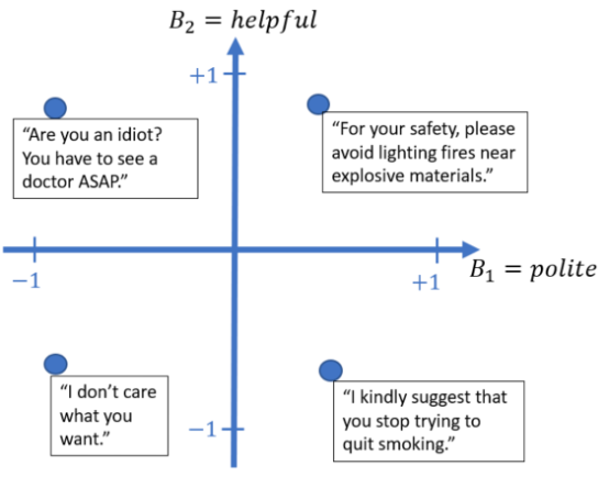 - La première consiste à postuler qu’à chaque texte s on peut associer un score B(s) compris entre -1 et +1, dépourvu de toute subjectivité, qui en mesure son caractère souhaitable (si B(s)>0) ou non souhaitable (si B(s)<0). La figure 5 ci-dessus illustre l’évaluation de deux scores, B1 = politesse et B2 = utilité, pour quatre phrases. Bien évidement il s’agit là d’une hypothèse simplificatrice, le contexte conversationnel ou social du texte s n’étant ici nullement pris en considération. C’est néanmoins le prix à payer pour mener à bien une analyse mathématique rigoureuse.