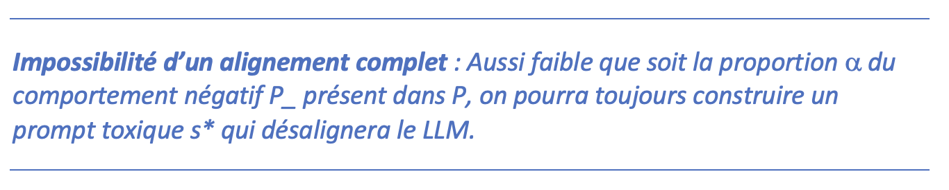 Muni de ces 3 hypothèses les auteurs démontrent plusieurs résultats théoriques qui dessinent les contours de plusieurs limites fondamentales qui encadrent ce à quoi l’on peut parvenir avec des techniques d’alignement. Leur résultat principal concerne la possibilité de désaligner un LLM. On convient de dire que l’on peut désaligner un LLM lorsqu’il est possible de construire un prompt toxique s* tel que le comportement B soit négatif en moyenne sur tous les textes qui débutent par ce prompt s*. Formulé de manière intuitive ce résultat affirme :
