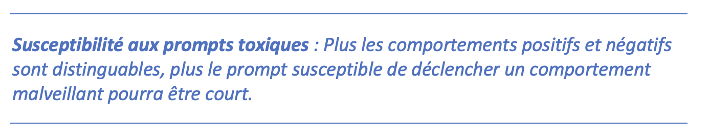 - La seconde hypothèse concerne la distribution de probabilité P définie par un LLM. Cette distribution, rappelons-le, est une distribution de probabilité sur les textes s. Les auteurs formulent l’hypothèse, étayée par plusieurs expérimentations, selon laquelle cette distribution P est en réalité un mélange de deux ou plusieurs persona au comportement plus ou moins toxique. Dans sa version la plus simple on suppose que P = α P_ + (1-α) P+ où P_ correspond à un persona ayant un comportement B négatif, en moyenne sur toutes les phrases s, alors que P+ possède un comportement B positif, en moyenne. On suppose que 0 < α < 1, en particulier on suppose que le comportement négatif est effectivement présent.