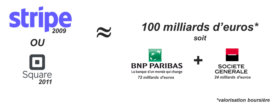 Deux entreprises créées aux alentours de 2010, SQUARE en 2009 (5500 collaborateurs) et STRIPE en 2011 (3000 collaborateurs) frôlent respectivement les 100 milliards d’euros de valorisation soit plus que BNPP (double centenaire et 200.000 collaborateurs) et SOCGEN (créée en 1864 par Napoléon III et 130.000 collaborateurs) réunies : que se passe-t-il ?