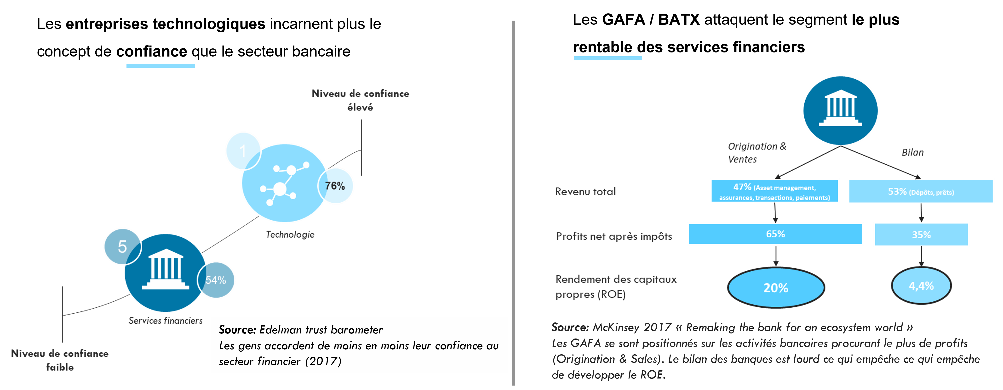 Les GAFA et BATX se sont positionnés historiquement sur le domaine du paiement car c’est celui qui est à la fois le plus proche de leur activité (achat de service ou bien) mais aussi et surtout car c’est le domaine le plus rentable de l’univers bancaire (ROE = 20%). Progressivement, ils s’implantent dans le domaine de la facilité de paiement et le leasing, portes d’entrée vers le crédit puis vers les produits d’épargne (ex. cashback à la frontière entre paiement et épargne) et d’investissement