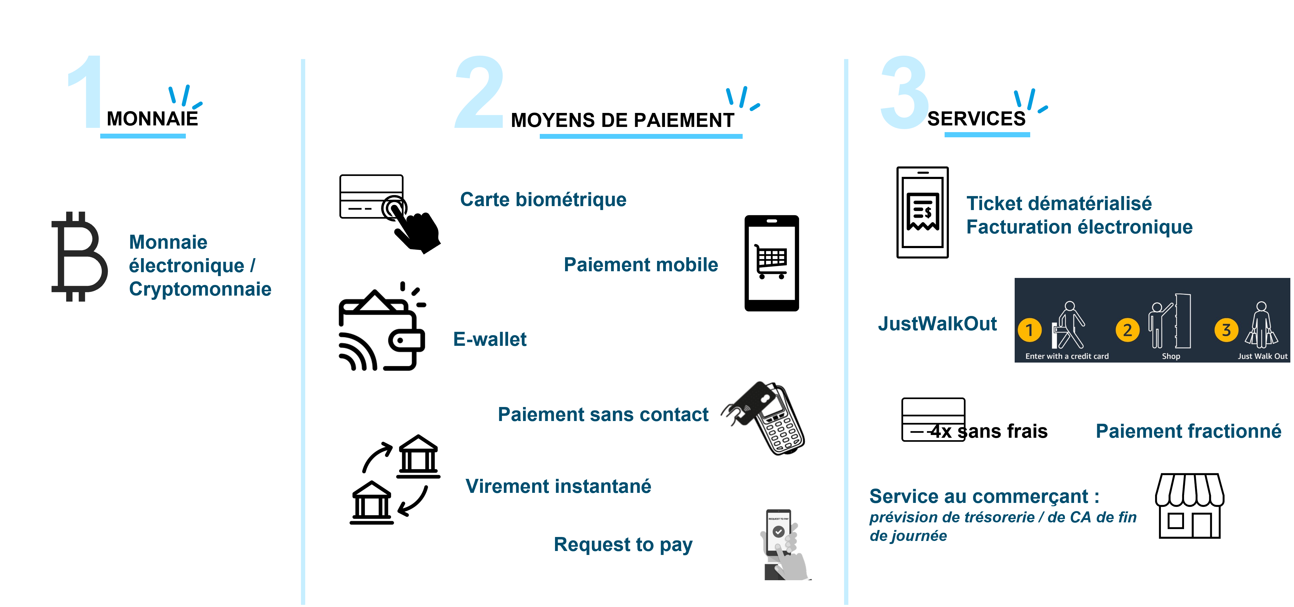 • les moyens de paiement (technique permettant d’utiliser la monnaie pour opérer la transaction)
