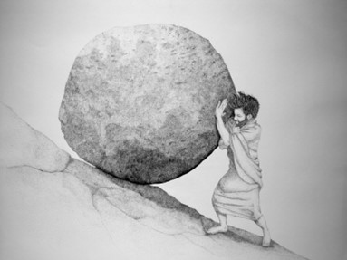 Albert Camus nous aide pour la suite car dans le regard qu’il porte sur ce mythe il s’intéresse aux pensées de Sisyphe – à la conscience qu’il a de sa situation – lorsque celui-ci descend de la montagne pour recommencer de nouveau son épuisante ascension en poussant le rocher :