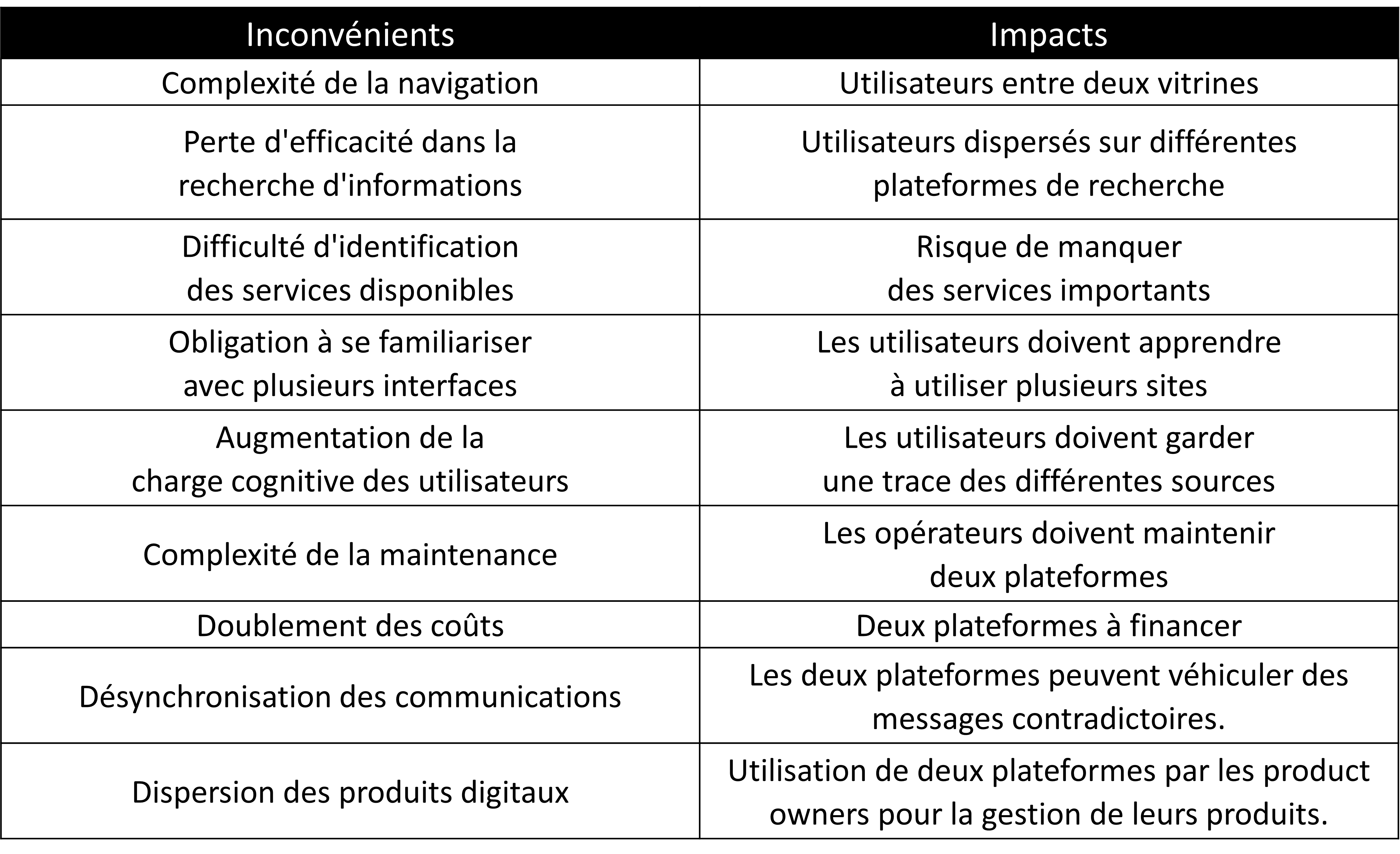 En créant deux vitrines distinctes, cela complexifie la navigation, cela rend la recherche d’informations plus ardue et génère de la confusion quant aux services disponibles.