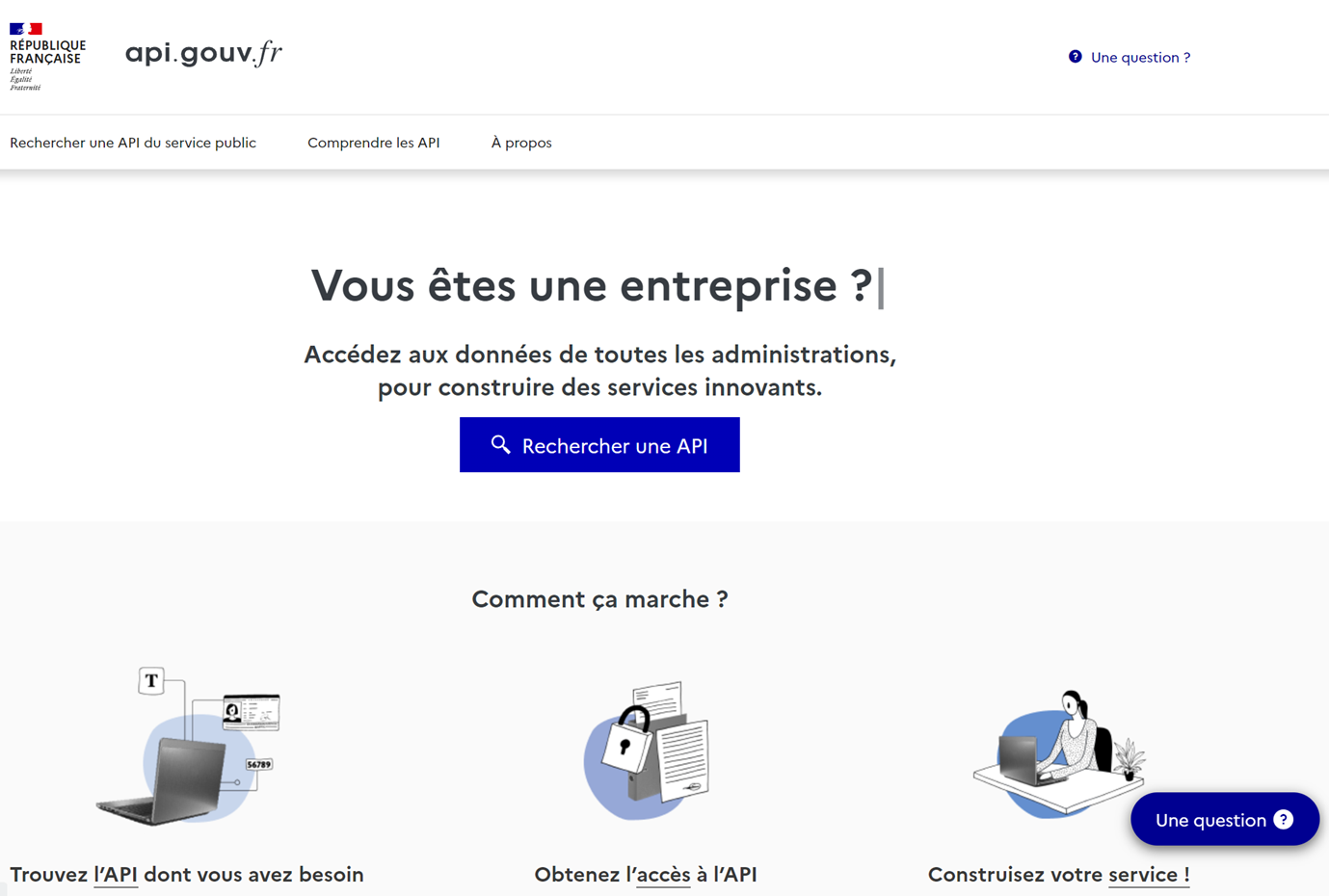 Cinq and plus tard, en 2016, la DSI de l’Etat (la Dinsic) a pris l’initiative de mettre en ligne son magasin d’API [12] :  API.gouv.fr.