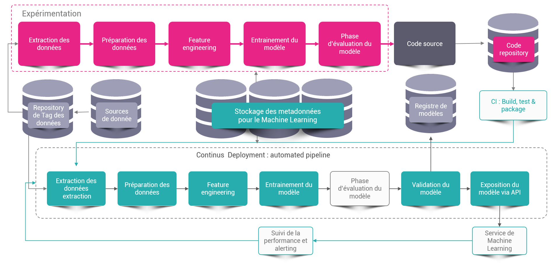 La figure 1 illustre une chaîne MLOps. Elle débute par une phase d’expérimentation (phase de développement réalisée par les Data Scientists) de laquelle émerge les algorithmes de Machine Learning destinés à entrainer les modèles sur des jeux de données. Ces algorithmes sont stockés dans un code repository exploité par la chaîne d’intégration continue (CI) comme dans un projet DevOps classique.