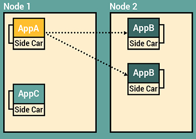 Après quelques tentatives passées (notamment par Linkerd dans sa première version), les Services Mesh ont aujourd’hui construit une solution élégante pour contourner ces écueils : externaliser l’ensemble des configurations et du runtime des échanges interapplicatifs dans une brique appelée « sidecar ».